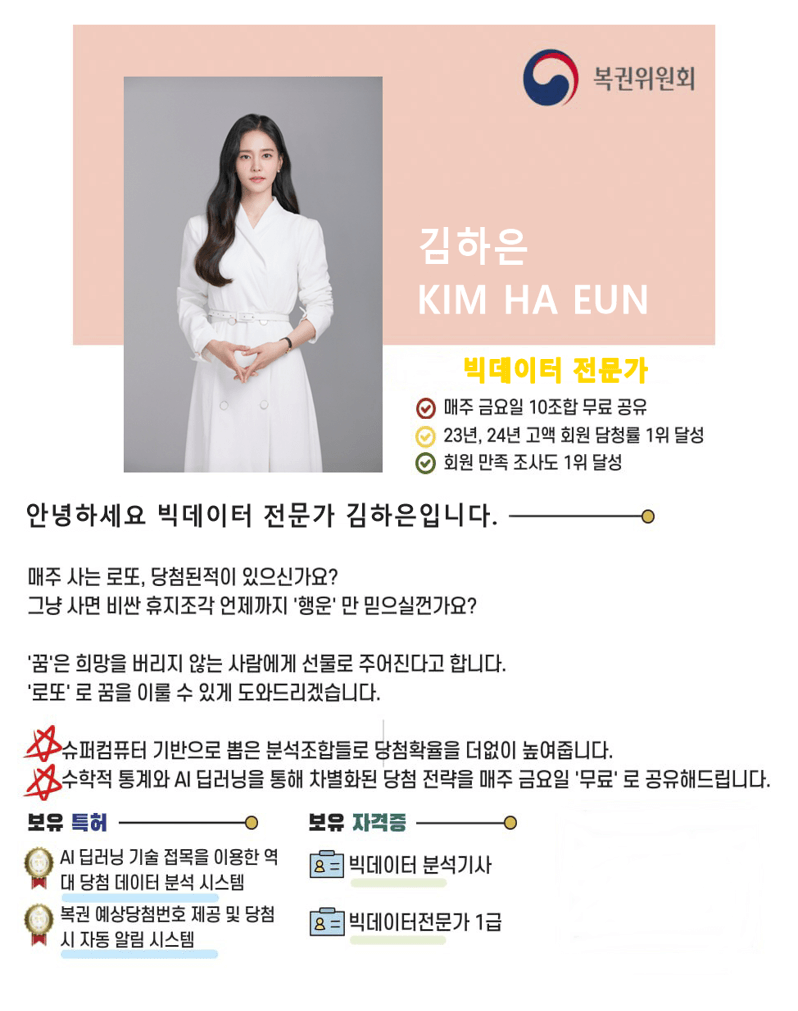 저 "김하은"에게 무료 조합 번호 10가지 매주 금요일에 받아가세요!
